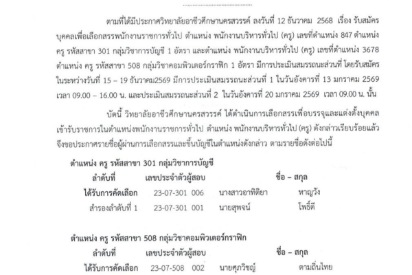 เรื่อง รายชื่อผู้ผ่านการเลือกสรรและขึ้นบัญชีพนักงานราชการ ตำแหน่ง พนักงานบริหารทั่วไป (ครู) กลุ่มวิชาการบัญชี และกลุ่มวิชาคอมพิวเตอร์กราฟิก