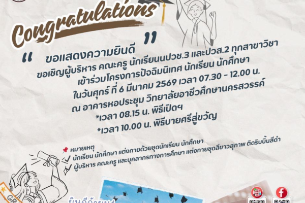 วิทยาลัยอาชีวศึกษานครสวรรค์ ขอเชิญผู้บริหาร คณะครู บุคลากรทางการศึกษา นักเรียนระดับประกาศนียบัตรวิชาชีพชั้นปีที่ 3 (ปวช.3) และนักศึกษาระดับประกาศนียบัตรวิชาชีพชั้นสูง ชั้นปีที่ 2 (ปวส.2) ทุกแผนกวิชา เข้าร่วม โครงการปัจฉิมนิเทศ นักเรียน นักศึกษา ประจำปีการศึกษา 2568 เพื่อเป็นการเสริมสร้างขวัญและกำลังใจ แสดงความรัก ความผูกพัน และเตรียมความพร้อมก่อนก้าวสู่เส้นทางชีวิตและการทำงานในอนาคตอย่างมั่นใจวันศุกร์ที่ 6 มีนาคม 2569เวลา 07.30 – 12.00 น.ณ อาคารหอประชุม วิทยาลัยอาชีวศึกษานครสวรรค์กิจกรรมภายในงานเวลา 08.15 น. พิธีเปิดโครงการเวลา 10.00 น. พิธีบายศรีสู่ขวัญ เพื่ออวยพรและส่งกำลังใจให้แก่นักเรียน นักศึกษาหมายเหตุนักเรียน นักศึกษา แต่งกายด้วยชุดนักเรียน นักศึกษาผู้บริหาร คณะครู และบุคลากรทางการศึกษา แต่งกายชุดสีขาวสุภาพ ติดริบบิ้นสีดำขอเชิญร่วมเป็นส่วนหนึ่งของช่วงเวลาสำคัญ สร้างความทรงจำอันงดงาม และส่งต่อพลังใจให้แก่นักเรียน นักศึกษา ก่อนก้าวสู่อนาคตอย่างภาคภูมิ
